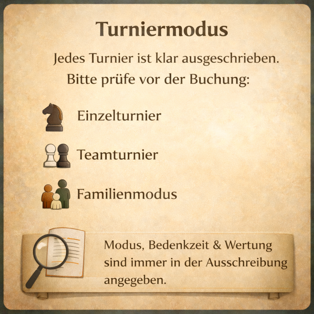 Der genaue Modus sowie Bedenkzeit und Wertung sind immer in der Ausschreibung angegeben.